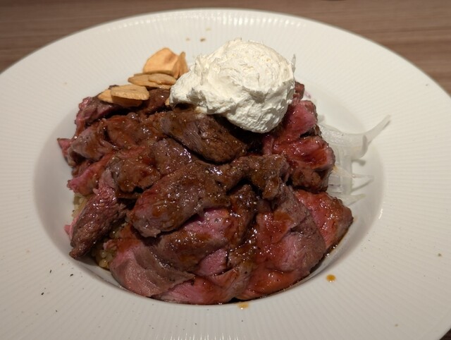 頂上に添えられているのは、まるでホイップクリームのように見えるホイップバター!これがまた、熱々の肉とご飯にじんわり溶けて、コクと風味をさらに引き立ててくれます。スライスガーリックの香ばしさも相まって、食欲が止まらない!