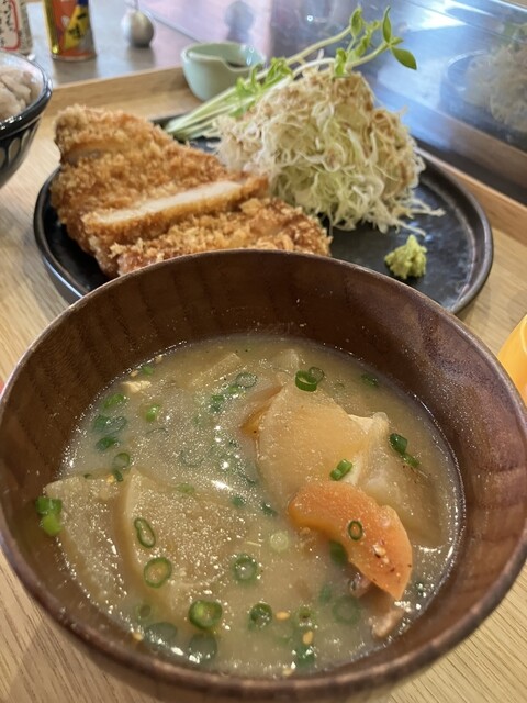 メインのカツは糀漬の効果か、肉厚でも柔らかくジューシーで口いっぱいに旨みが広がる。ソースの他塩とワサビが添えられているので、始めの一切れ目は塩だけで、続いてワサビをのせて、そして最後にソースでと、味変を楽しめる。