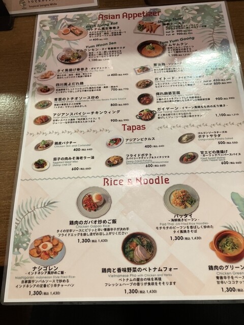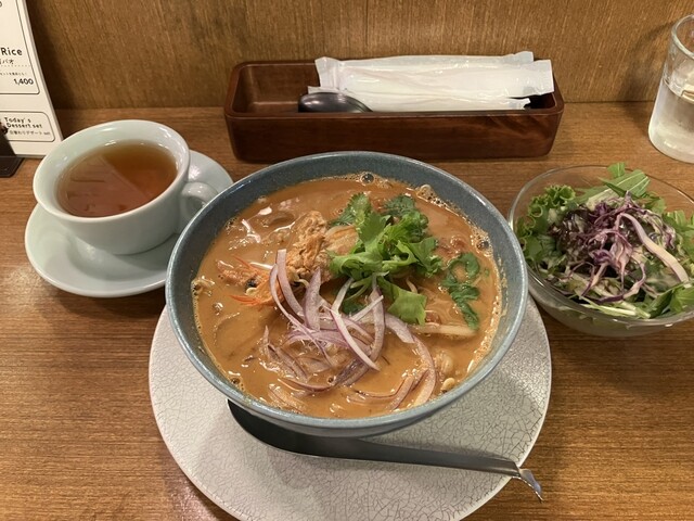 オリジナルのとうもろこしペーストのドレッシングのかかったサラダと、レモングラスジャスミンティーやパイナップルグリーンティーなど個性的なメニューから選べるドリンクも付いて1200円。大満足なランチタイムとなりました。