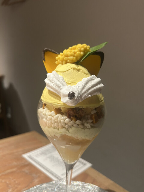 このパフェは夏の終わりの名残と秋の予感をぎゅっと閉じ込めたような一杯で、ビジュアルからして心を掴まれました(きつねが可愛すぎる…後ろに尻尾ついてるのも良すぎる…こういうこだわりが本当にすごいの)