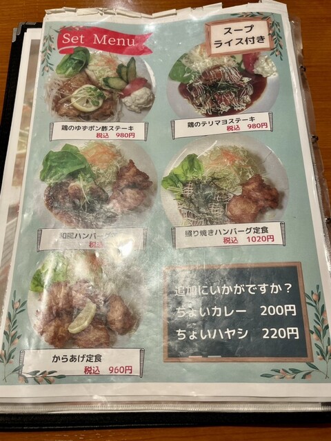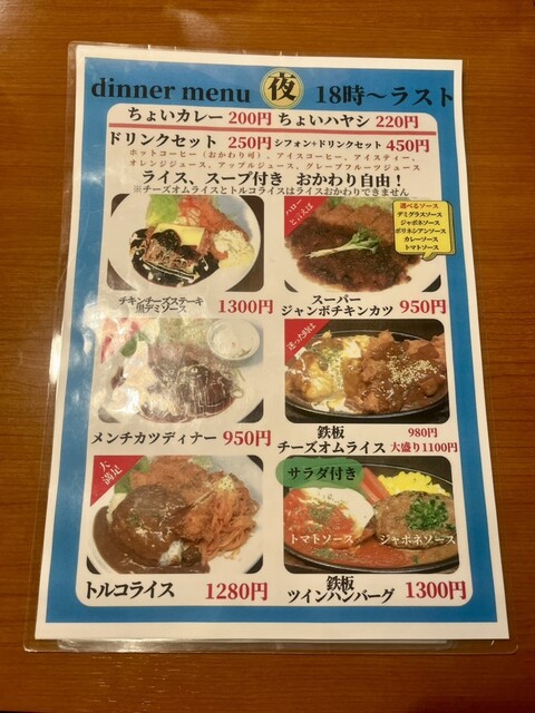 『チキン南蛮定食・半熟玉子のオムハヤシ・A定食』を注文しました。チキン南蛮は柔らかくジューシーな鶏肉に手作りのタルタルソースがたっぷりと乗ってます。美味しい。甘酢の酸味も丁度良くてご飯が進みます。半熟玉子のオムハヤシは玉子がトロトロでボリュームもあり大満足。A定食のハンバーグはしっかりとした肉の旨みがあり美味。カツはあっさりした和風ソースでこれまた美味。1番驚いたのは飲み放題のスープが美味しいこと。家族みんなに大好評でした。チョコバナナパフェと雪見ぜんざいはとにかく注文後に来るのが遅い。パフェへ10分、ぜんざいに関しては20分以上待ちました。ぜんざいに小さな雪見だいふくが乗っているだけの料理なのに時間かかり過ぎです。喫茶店の看板メニューのはずのホットコーヒーは香りは無くコクも無く色が付いたお湯のよう。いくらおかわり可のコーヒーとはいえ喫茶店ならもう少しレベルを上げて貰いたい。パフェは美味しくて良かったのですがちょっとお高め。料理が美味しくボリュームもたっぷりで良かっただけに喫茶のサイドメニューが残念に思いました。ご馳走様でした。