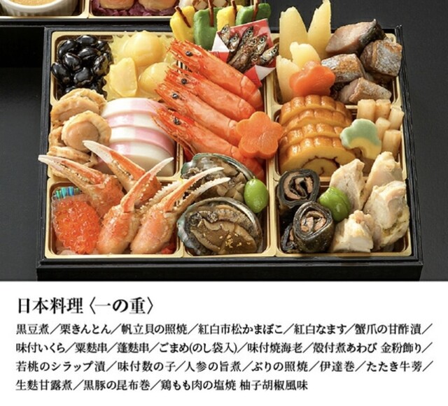黒豆煮/栗きんとん/帆立貝の照焼/紅白市松かまぼこ/紅白なます/蟹爪の甘酢漬/味付いくら/粟麩串/蓬麩串/ごまめ(のし袋入)/味付焼海老/殻付煮あわび金粉飾り/若桃のシラップ漬/味付数の子/人参の旨煮/ぶりの照焼/伊達巻/たたき牛蒡/生麩甘露煮/黒豚の昆布巻/鶏もも肉の塩焼柚子胡椒風味