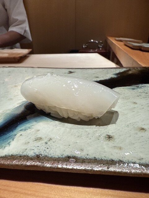 大分のカワハギ、サワラ、八丈島の中トロ、小肌、再び八丈島の中トロ、そして大トロ。マグロはすべて釣りあげとのこと。鹿児島スミイカ、山口宇部のクルマエビは火入れが絶妙。白子ごはん、兵庫の出来たてカラスミ、北海道野付のホタテ、巻物、いなりずしと続きます。