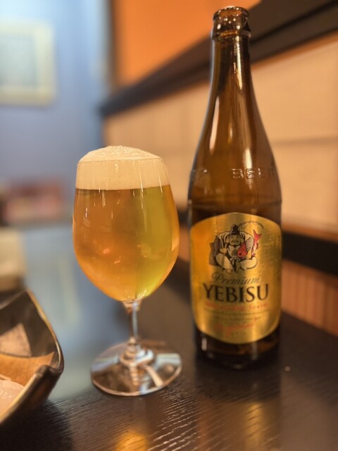 エビスビールで喉を潤して、もずく酢、鶏肉ネギ味噌焼き、地元石巻産の金華さば塩焼きで酒が進むー