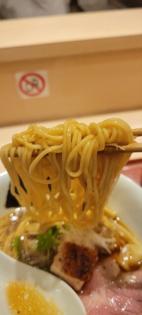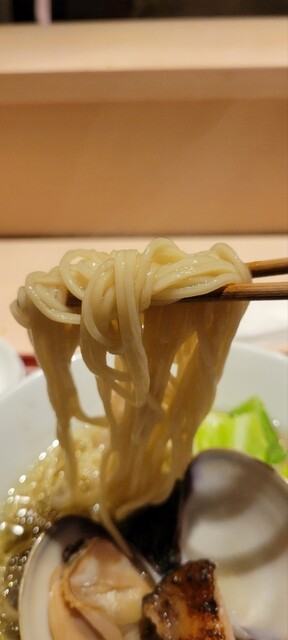 帆立やあさり等の良い食材を惜しげもなく使ったGW仕様の出汁は貝の旨味だけでなく麺助鶏の動物系の旨味が複雑に絡み合った深く奥行きのある味わいでそれを麺助謹製平打ちの中細麺に絡んでいきます。