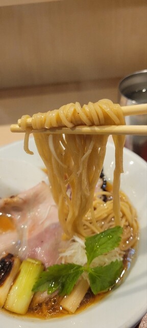 そして麺、まずビジュアルが良すぎる!艶やかな小麦色が映えるストレートの中細麺でツルツルと啜り心地よく噛むとパツパツともちもちの中間でめちゃくちゃ絶妙なバランスの食感、まるで極上のお蕎麦を食べているかのような・・・極上麺