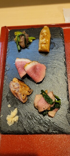 盛り合わせは青森産山菜やわさびを挟んだ鴨や行者ニンニクと全て美味すぎ!