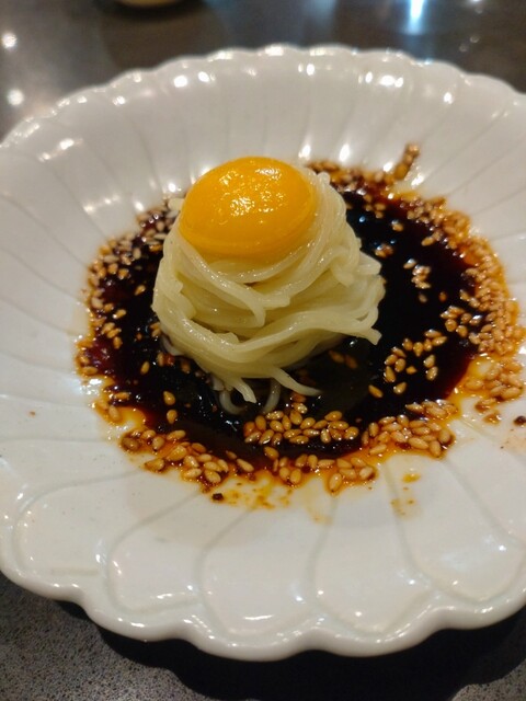 山椒のいい香りに一口大の麺を。鶉の卵を和えて辛味もマイルドになります。