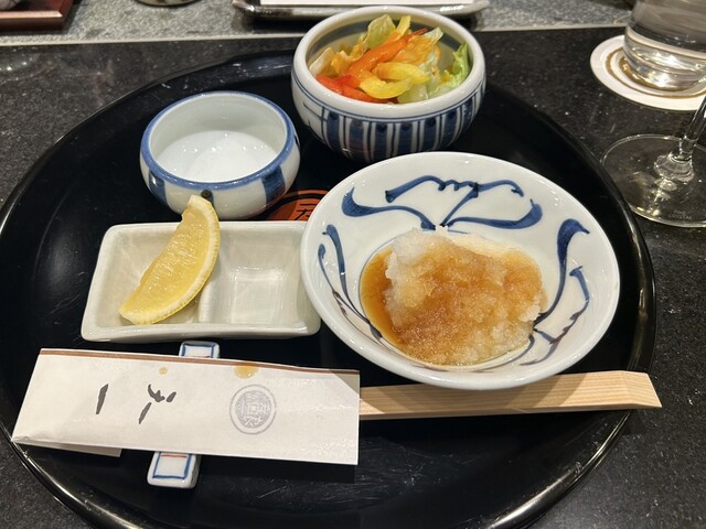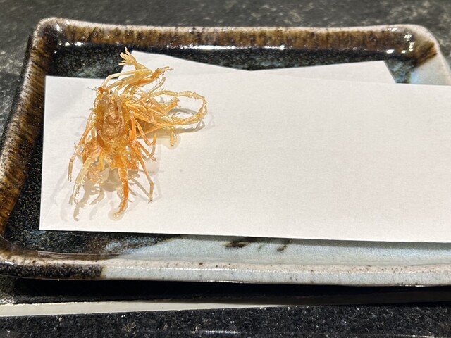 小玉ねぎ、穴子、しし唐が提供され小玉ねぎは程よい火加減で食感良く甘みがあり美味しく、穴子は大きさの割に肉厚で食感よく旨味もあり美味しく頂けました。