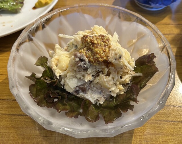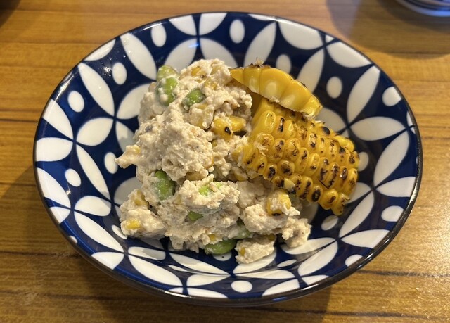 箸休めに白和えとポテトサラダを注文、白和えには焼きもろこしと枝豆が一緒に和えられて、香ばしさと枝豆の食感が加り、ポテトサラダには細かく切られた いぶりがっこと へしこが入り、これも香りと食感が良く箸が進みお酒も進みます。