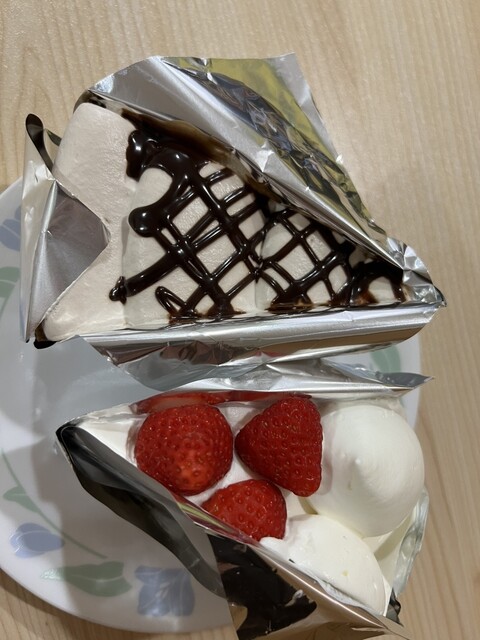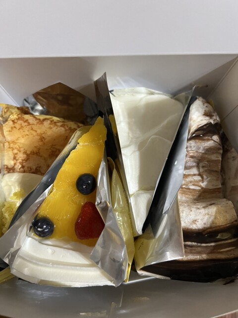 左からミルクレープ、フレッシュフルーツ、レモンヨーグルト、チョコレートムース