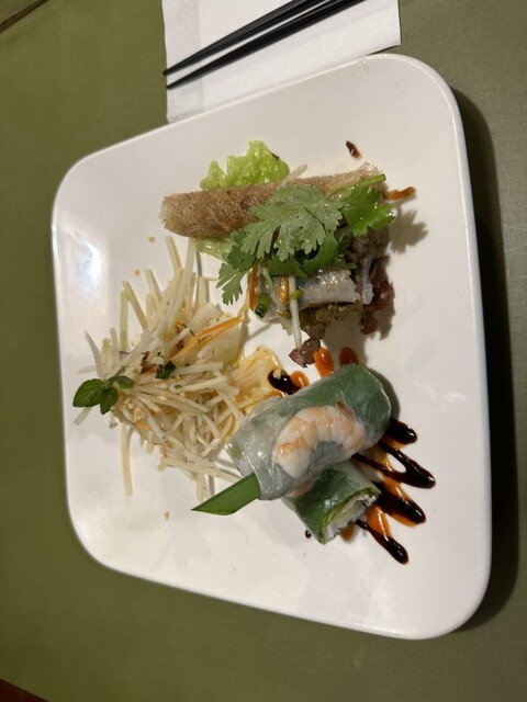 5度目の訪問。小中学生の子供2人と嫁さん、家族4人で土曜日お昼に訪問。相変わらずの混雑でしたが、1時を回っていたので、10分位で着座。大人2人は、ホリディランチセット1560円を頼みました。前菜三種もり、生春巻き、揚げ春巻き等、めちゃめちゃ、んまんま。メインの牛フォーも、塩ベースで、出汁がよく出ており、とても優しい味で、んまんまです。また、行きまーす。