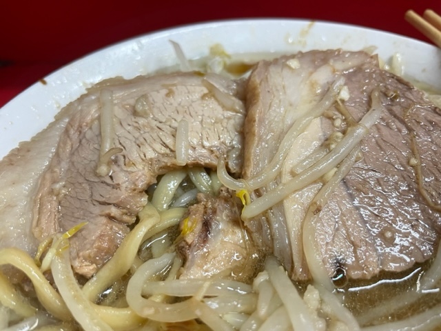 毎回異なる趣が楽しめる本店さん。本日はスープは少し薄めの非乳化に平打ちの超デロ麺とクタ野菜、ブタカスが混ざるアブラでクタ野菜を食べ始め、中からデロ麺を引き出します。至福の時間の始まりです。旨辛のニンニクを溶かし入れながら味をパワーアップさせてゆきます。巨大な豚が2枚出てきました。歯ごたえを残しながらも柔らかく脂身とのバランスも良いですね。後半に残しておくときつくなるので早めにやっつけます。本日は全く苦しくならずに完食です。着丼まで1時間強でしたが、僅か10分足らずの食後には並んでよかったといつも思います。ご馳走様でした。