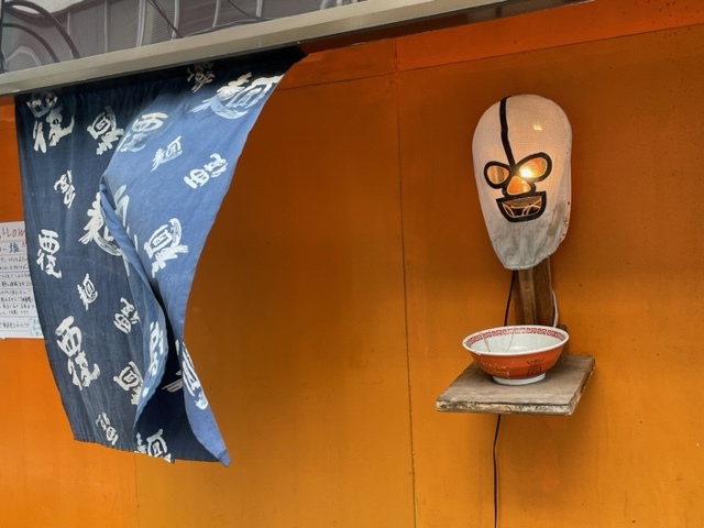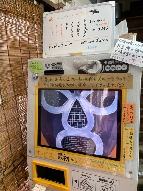 神保町駅徒歩2~3分の路地裏的なところにあります。今までも行列すぎて諦めたり、時間が遅くなり麺切れになってしまったりと苦渋の日々が続き、本日も常連さん達で行列をなす中、やっとのことで初訪問となりました。しかも通常の火曜の塩デーだけでなくハロウィンスペシャルメニューの日です。本日はお弟子さんとともに覆面姿の店主さんより無事メンバーズカードを頂き、仲間入りさせてもらいました。猪木ボンバーイエイがこんなに心地よく聞こえるお店は他にないでしょう。