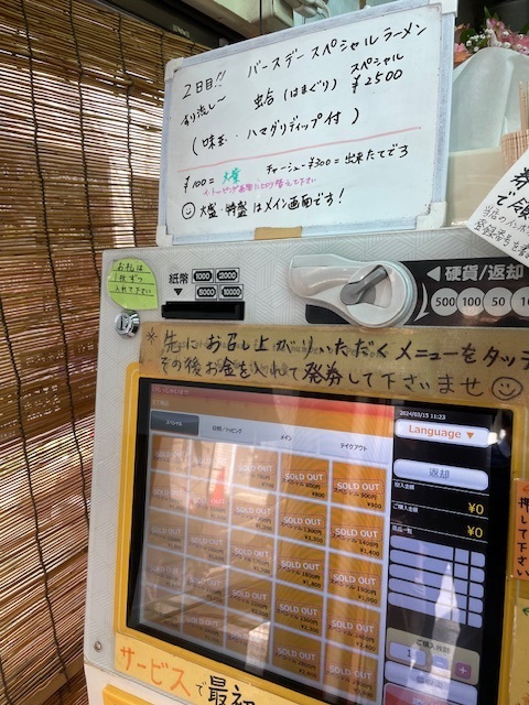 神保町駅徒歩2~3分の路地裏的なところにあります。本日は及川店主さんのハッピー バースデースペシャルラーメンの二日目です。神保町駅乗換が11時半頃、もう行列かなと思いながら路地を見ると3名しか並んでおりません。これは行くしかないと思い会員カードを取り出してフリッターを付けてもらい、2500円のラーメンを堪能してきました。食後には予想通り20名以上は並んでましたのでラッキーでしたね。