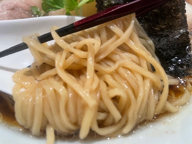 接客も感じが良く、落着いて心地よいカウンターから一望できる厨房での大将やスタッフさんの丁寧な仕事ぶりや並んでいる豪華なチャーシューや松茸など具材を見ているだけで、待つことが苦にならないばかりか、早く調理されたラーメンに出会えることが非常に楽しくなってきます。特製を頼んだわけではないですが、普通のお店だと全部のせレベルです。大きなバラロール、薫陶の厚切り豚、柔らかな鶏ムネのチャーシューが3種、ほのかな生姜が香る鶏ツミレ団子、お店特製の煮付大根、よく味がのっているメンマ、磯の香り漂う高級海苔、ネギ、三葉、トロトロ寸前の半熟味玉など豪華な具材で満載です。この具材にキレとマイルドさ加減抜群の鶏出汁を中心とした清湯スープと柔らかめのシルキーな自家製細麺。醤油ラーメンは卓上胡椒もおススメとのことで、これまた別の味わいになり格別です。当然完飲完食、ご馳走様でした。