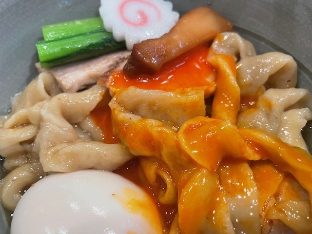 極太麺を食べてみたかったので極太麺を使用している油そば、肉南蛮の二択となりましたが、看板メニューとおぼしき油そばを注文です。お店の外まで漂う出汁の香りが素晴らしいです。本日の出汁は伊吹いりこ、あじ、さば、あご、エソ、かつを、酒、宗田、カマス、昆布、どんこ、豚 他とのことです。着丼すると見たこともない一杯が提供されました。名前こそ油そばですが、汁の少ないという点以外は世間一般の油そばとは全く異なります。出汁スープの中に極太の手揉み麺、その上にチャーシュー、メンマ、青菜、ナルト、味玉、卵黄が鎮座しており上品な外観です。先ずは卵黄を崩さずに麺を中から持ち上げて啜って(食べて)みます。ツルンとモッチリした食べ応えのある食感に出しスープが絡み、これだけでも十分なほどの完成度です。1/3ほど食べた所で卵黄を崩してみると、超濃厚で甘い卵黄が麺と出汁に絡みます。小ぶりですがホロホロのチャーシュー、シャキッとした青菜、コリっとしたメンマやナルトなどの具材も名脇役ぶりを発揮しています。最後の具材の味玉を食べてみると、中の黄身が超濃厚のジャムかママレードのような状態で、こんな味玉食べたことがありません。卵黄も味玉でもかつてないほどの味わいでした。そして仕上げに飲んだ出汁スープで至福の時間が終了です。全知的な感想としてはラーメンというよりは高級で上品な和麺といった感じです。訪問ハードル高いですが再訪確定です。完飲完食、ご馳走様でした。