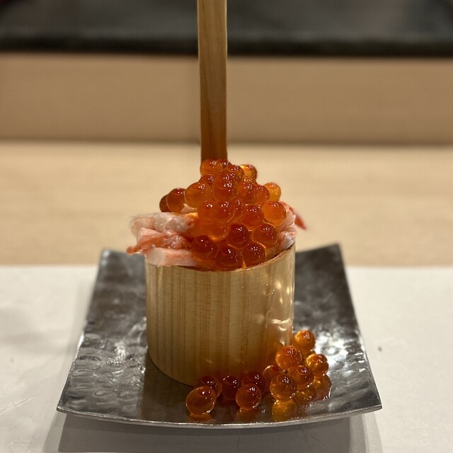 キャビアが乗った海老のお寿司は、プリッとした海老とキャビアの塩気の相性が良く最高