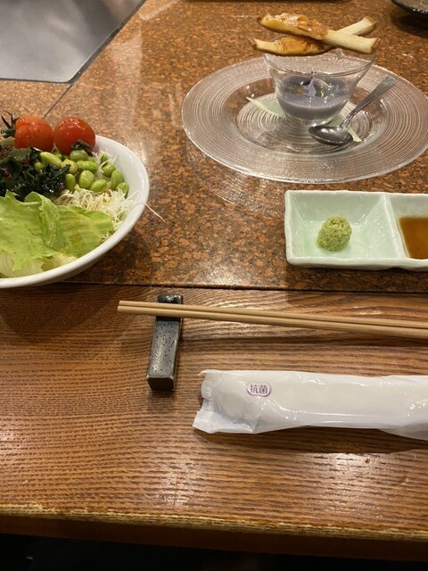 予約してきましたが、店内は焼肉個室はほぼ満席。鉄板ステーキが目的だったので、カウンターに案内。鉄板はそこまでいっぱいではなかったです。