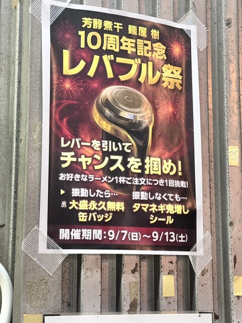 ▶︎現在❗️10周年イベント中で(〜9/13(土)まで)、ラーメン一杯頼むごとにレバーを引ける大チャンスです。詳細は写真3枚目をご覧下さい。(ちなみに過去の周年イベントで配布された玉ねぎ鬼マシ永久無料券を持っていれば持っているほどレバーを引ける回数が増えます。)