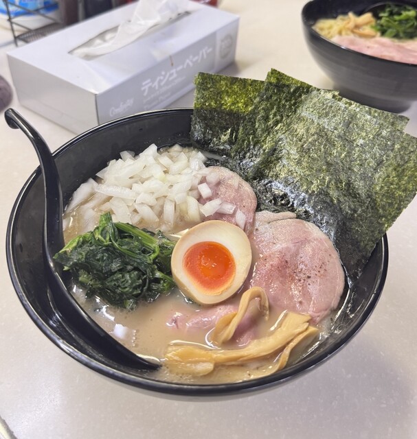 ▶︎いつもおいしい♪クリーミーなスープと中太麺の相性がグッド。デフォルトの煮干感は強くないため人を選ばず食べられるのが魅力的です♪煮干感が足りないあなたは、卓上の魚粉をどっしり使って煮干感をあげるのがオススメ。