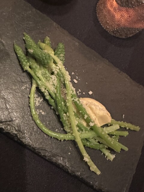 白い方、ホワイトアスパラの茶碗蒸し的なものらしいです。チーズ入ってて洋風な茶碗蒸しですね。