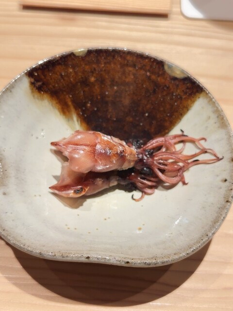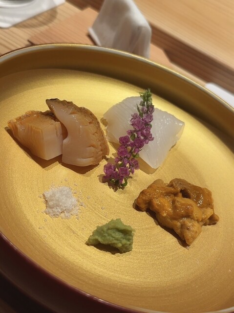⚫︎五島の水イカ、福岡でとれた生鮑、北九州のウニ 添えてあるのは紫蘇の花です。