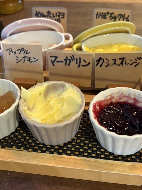 パンはビュッフェスタイルで自分で何度でも好きなだけ取りに行けて、種類も豊富。ディップも5種類ありました。