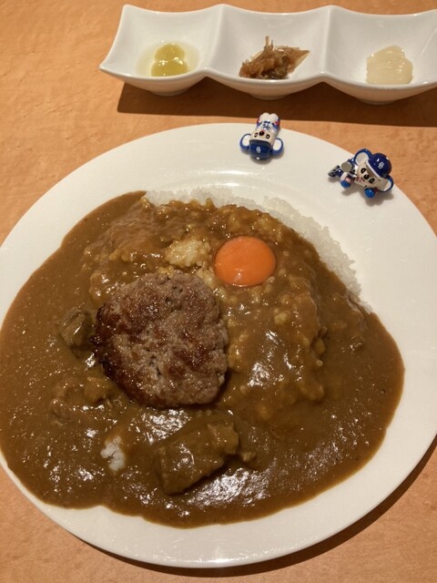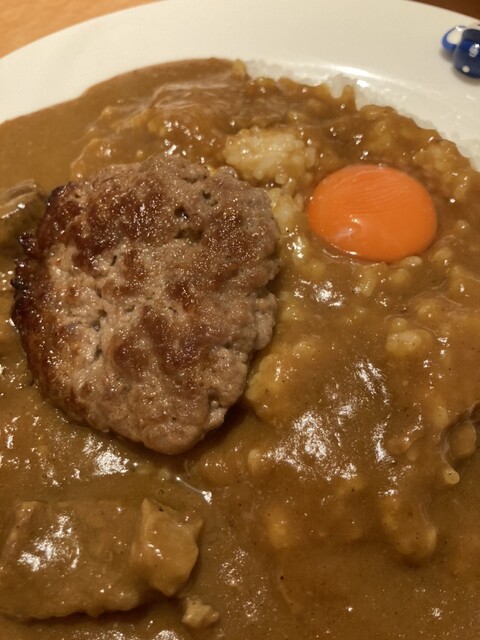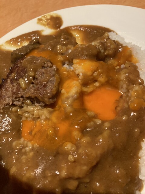 ビーフシチュー、カレー大盛り、カレーにハンバーグと、なんとか卵トッピング。