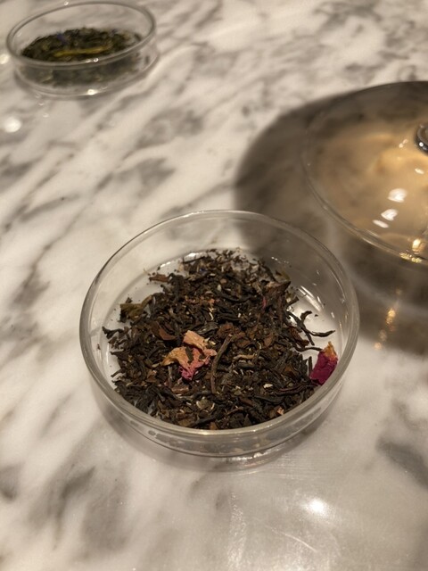 緑茶ベースの茶葉に、ローズの紅茶をのせた逸品。飲んだ事ない味や。