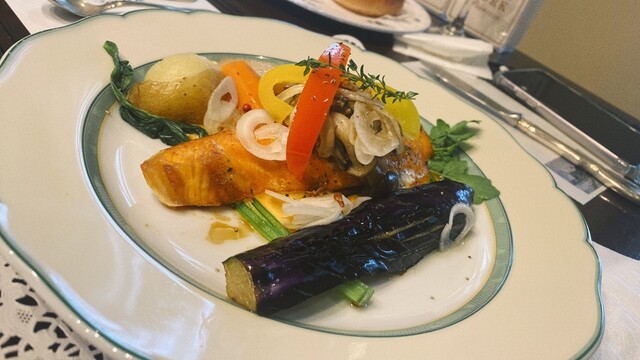 口コミでは肉が硬いというものもみかけましたが、この日はフォークで裂けるほどにほろほろな頬肉でした。鮭のほうも大変美味しかったです。4名とも少しシェアしあってメインを確かめましたが食後の感想も肉派と魚派で同数ずつ分かれました。