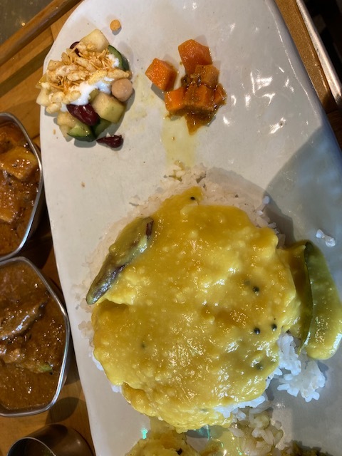 カレーの他にサンバル(粘度中・辛さ無)ラッサム(サラサラ)人参アチャールなどカレー以外に9種類ものっている、ご飯の上には豆カレー、これならカレー1種類でも十分だね、尚且つご飯・ラッサム・サンバルがお替りできる。