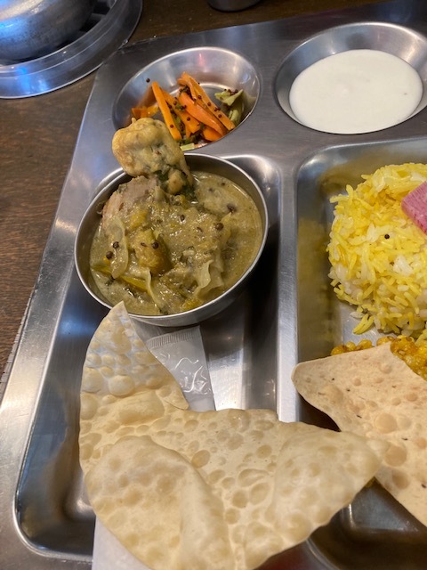1,200円のセットはカレー3種ついています、追加料金で別のカレーに反抗できるので100円プラスでタマゴカレーにします。チャイ(お替りできます)付きで1300円