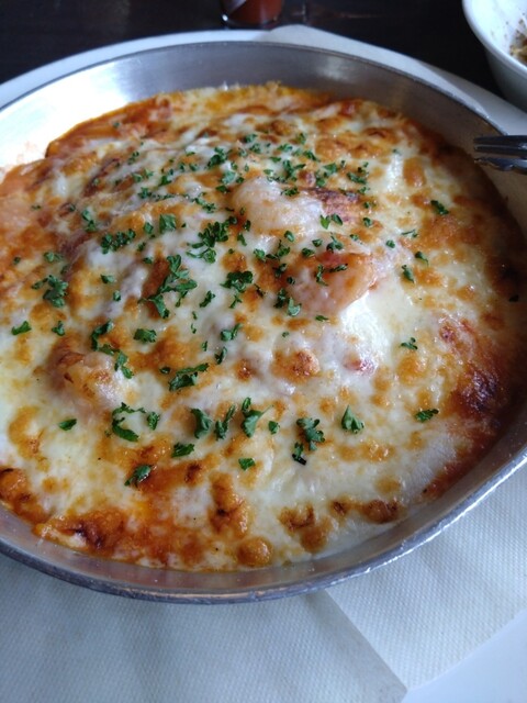 開店と同時に伺いました❢海老ナポリタンと、海老クリ―ムグラタンパスタ110円のサラダを注文致しました❢サ―ビスのドリンクも、頼みました❢先ずはサラダが運ばれてきました❢大根サラダです❢ドレッシングがもう少しかかってたら、もっと美味しくいただけたと思います❢海老ナポリタンが、最初に運ばれてきました❢ナポリタンが食べ終わる頃、グラタンパスタが運ばれてきました❢でもお値段が上がりましたね。1人2千円計算です❢今のご時世仕方ないのでしょうね。とても美味しかったです❢御馳走様でした❢