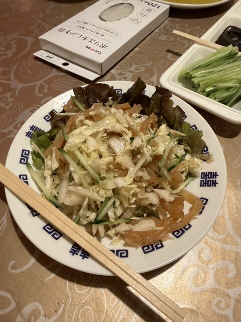 北京ダックは皮だけかと思ったら肉もしっかり付いていて、ジューシー。