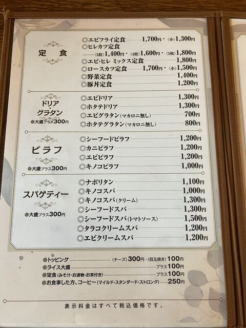 知人の紹介で訪問。落ち着いた喫茶店の雰囲気。金曜日の夜でほぼ満席でしたが運よくすぐ着席。どれも美味しそうなメニューで迷いましたが、ポークソテー大(甘醤油、2000円)とエビグラタンを注文。