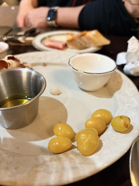 お料理は前菜の盛り合わせ(写真撮り忘れた)▷▶︎ズッキーニのステーキの生ハム添え▷▶︎大っきい銀杏をオリーブオイルとお塩で食べるやつ▷▶︎裏亀ホルモン煮込み(赤)withバケット▷▶︎赤エビのグリル▷▶︎いかすみパスタ▷▶︎ゴルゴンゾーラのショートパスタ