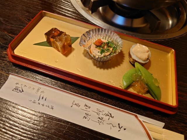 前菜は河豚唐揚げ、煮凝り、マリネ、スモークサーモン、味噌胡瓜