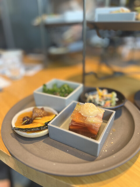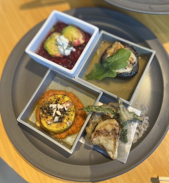 窓側確定のランチメニューを予約しました。案内も丁寧でお席も広々としていて印象からとてもイイ感じです。テーブルにはお品書き♪お料理の説明も丁寧にしてくださいました。お肉もお魚もないのですがしっかりお腹いっぱいになるボリュームと美味しさです。野菜だけの色々なお料理でこんなに楽しめるなんて大満足です。どれも美味しいのが素晴らしい。そしてこれはなんだろうねとゆっくり味わいながらそして会話しながらとても充実したランチになりました。また行きたいお店です。ただ時間が決まっているので、最後は急いで出なきゃ行けないのがちょっと残念でした…