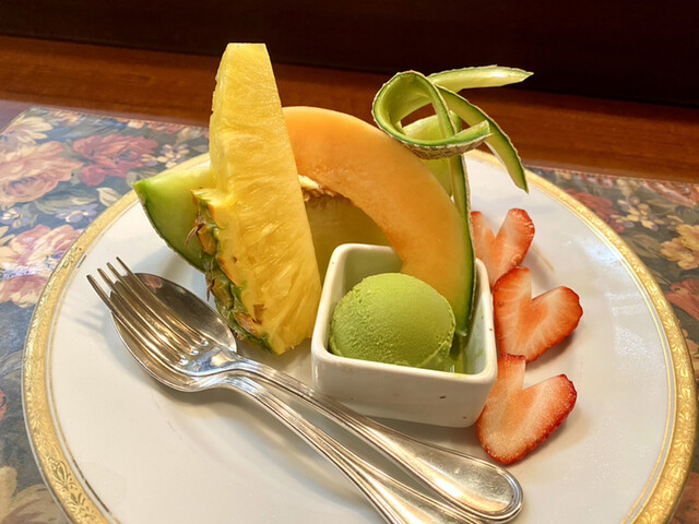 デザートはハートに切られた苺ちゃんたちフルーツ盛り。