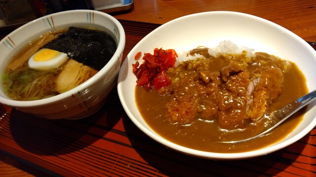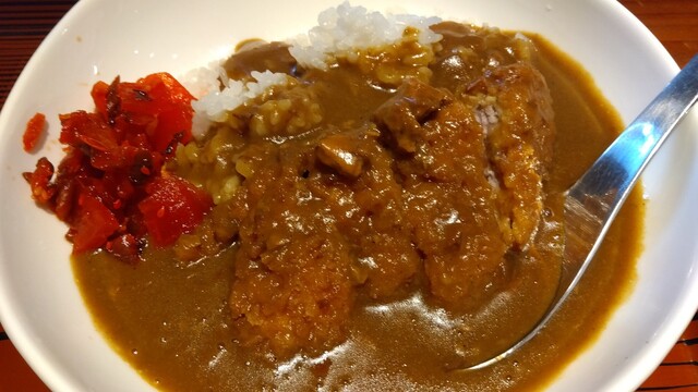お値段以上の満足感と懐かしさを味わえます。「カツカレー」は、懐かしい、グラスにスプーン入り。