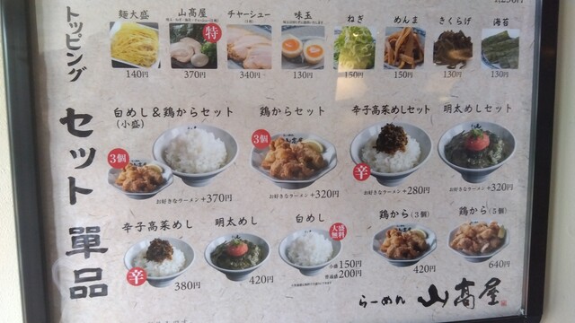 辛味噌らーめん 980円 + トッピング 山髙屋 370円・白めし(小)&鶏からセット 370円です。合計 1720円。