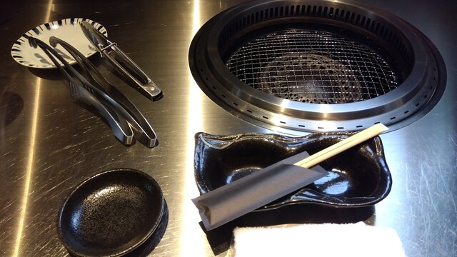 カウンターは、椅子が、8席ですが、二人ずつでの対応になっている様子。二人分の席の前に、焼肉網と、コンロに、お水入りの鍋が配置されています。