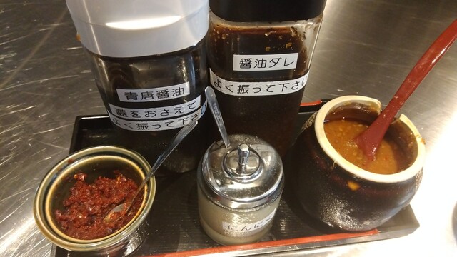先ず最初に、青唐醤油・醤油ダレ・七味を辛く和えたもの・おろしにんにく・味噌だれの五種類のたれと、ジョッキでのお冷が先に運ばれます。