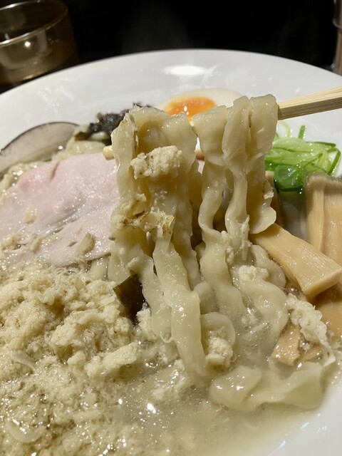 まずはスープを。牡蠣の風味がしっかりと味わえますね。麺は帆立を食べた時と同じく幅広のビラビラな麺で啜りごたえとスープ絡みが美味い!