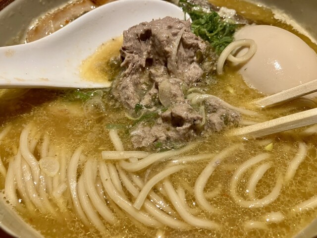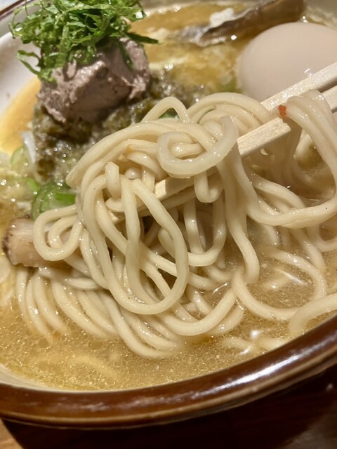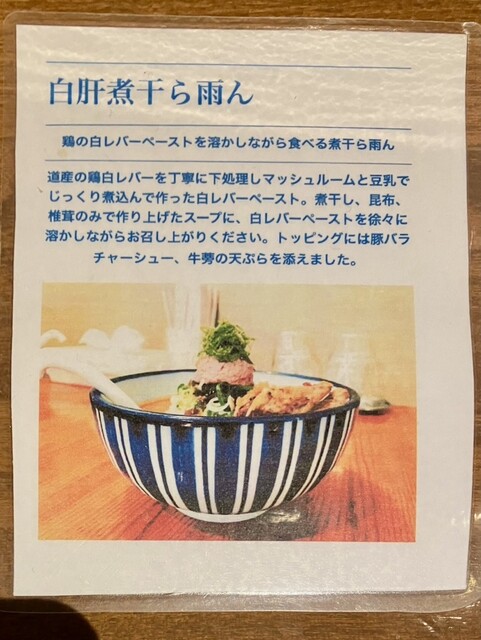 到着した一杯は柔らか牛蒡天、大きなチャーシュー、その上にネギとレバーペーストなどが浮かんでます。麺は中細ストレートであっさり味噌味のスープ。レバーペーストを少しずつスープに溶かしながら麺と合わせて啜り込むと、レバーのコクが合わさって、あっさりしたスープの旨みが増していきます。あぁ美味い!あっという間に完食です。