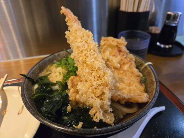 自分で天ぷらを選ぶスタイルなのも嬉しいポイント。ワカメとネギも入れ放題。