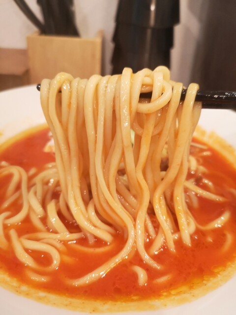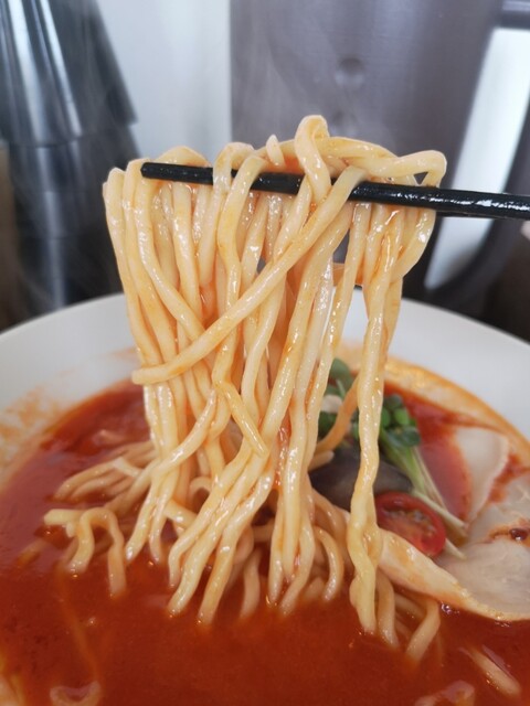トマトラーメンはストレートの太麺で、噛み応えの有る食感が楽しめます!