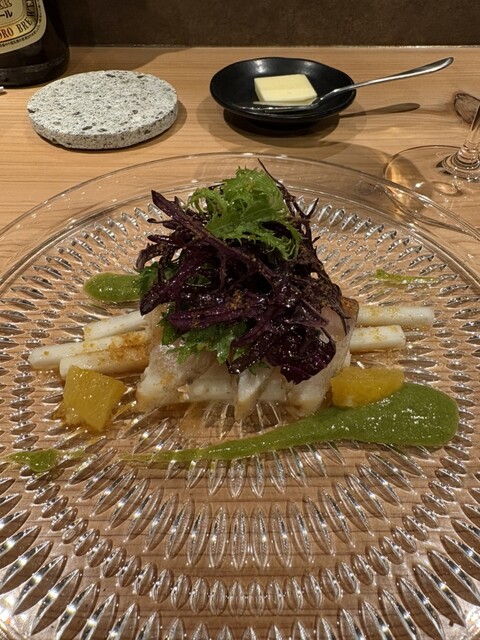 アミューズ3種から美味しく後続の期待が高まった中、次のアペタイザーの鰤のマリネが素晴らしかった。鰤の鋭い脂はマリネで旨味に変貌、柔らかな身はとても美味しい。フルーツカブと葉わさびが甘みや辛さのアクセント。そして茸コンソメスープはお皿の上に耐熱ビニールに包まれてサーブされ、ビニールを開封した途端に岩手産きのこの旨味が凝縮された蒸気が鼻腔を貫く。こんなに香るかというくらい。きのこの出汁がコンソメに合うんだ…美味しすぎる!まさに今が旬のシンプルながらに素晴らしい料理。そしてメインの一つ目は宮古産スズキのポワレ。火入れも良いがやはり身質が良い。切身のサイズが大きくナイフを入れるとふんわりで噛むとキュッとして良い。干草のソースが美味しいしセリの香りのアクセントがたまらん。メインの二つ目は北上産豚炭火焼き。とにかく豚が美味かった。ナイフは柔らかく通り、脂は甘くマスタードの粒と一緒に頬張ると噛むほどに渾然一体の美味しいソースとなって喉を通っていく。山わさびも素敵なアクセント。デザートは北上産バターナッツ南瓜アカシア蜂蜜のアイス。コーヒーと共に、南瓜のねっとり感と外側キャラメリゼの甘さと硬さ、南瓜と白味噌で作った焼菓子のスナック感にアイスの冷感。舌の愉しみが最後まで続きましたーーーー。