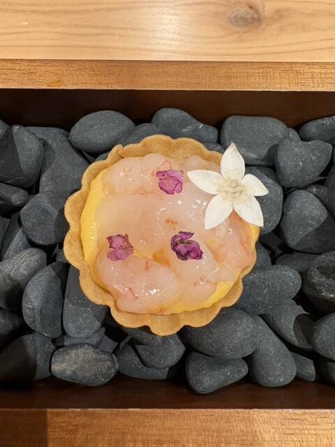 APPETIZER 三陸産鰤とフルーツカブのマリネ、鰤のマリネ仕事が素晴らしいし葉わさびも美味しい